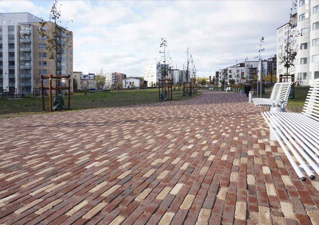 – Muualla puistossa on sirotepinta, mutta bulevardin alueelle haluttiin korkeatasoisempi pinnoite. Vaihtoehtoina olleista luonnonkivestä, betonitiilestä ja keraamisista tiilistä päädyttiin valitsemaan tiili, joka on betonikiveä viihtyisämpi ja toisaalta luonnonkiveä edullisempi, kertoo hankkeessa pääsuunnittelijana toiminut Sitowise Oy:n Ismo Häkkinen.