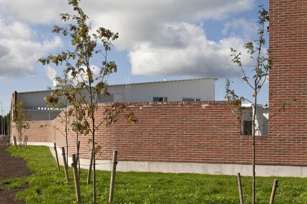 Yhdysvaltain suurlähetystössä Helsingissä tiilipilarit tukevat muuten metallirunkoista aitaa. Kokonaisuus on klassinen ja arvokkaan oloinen.