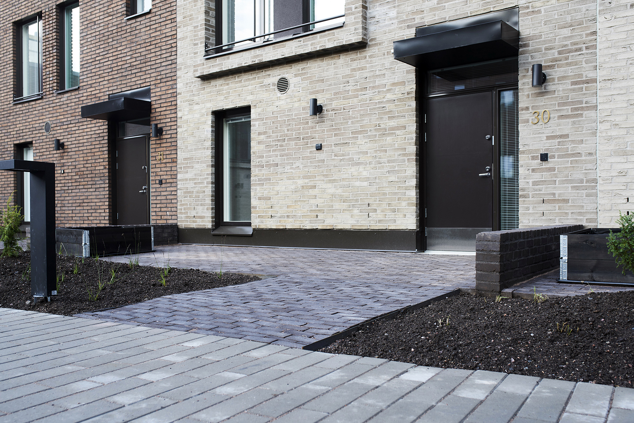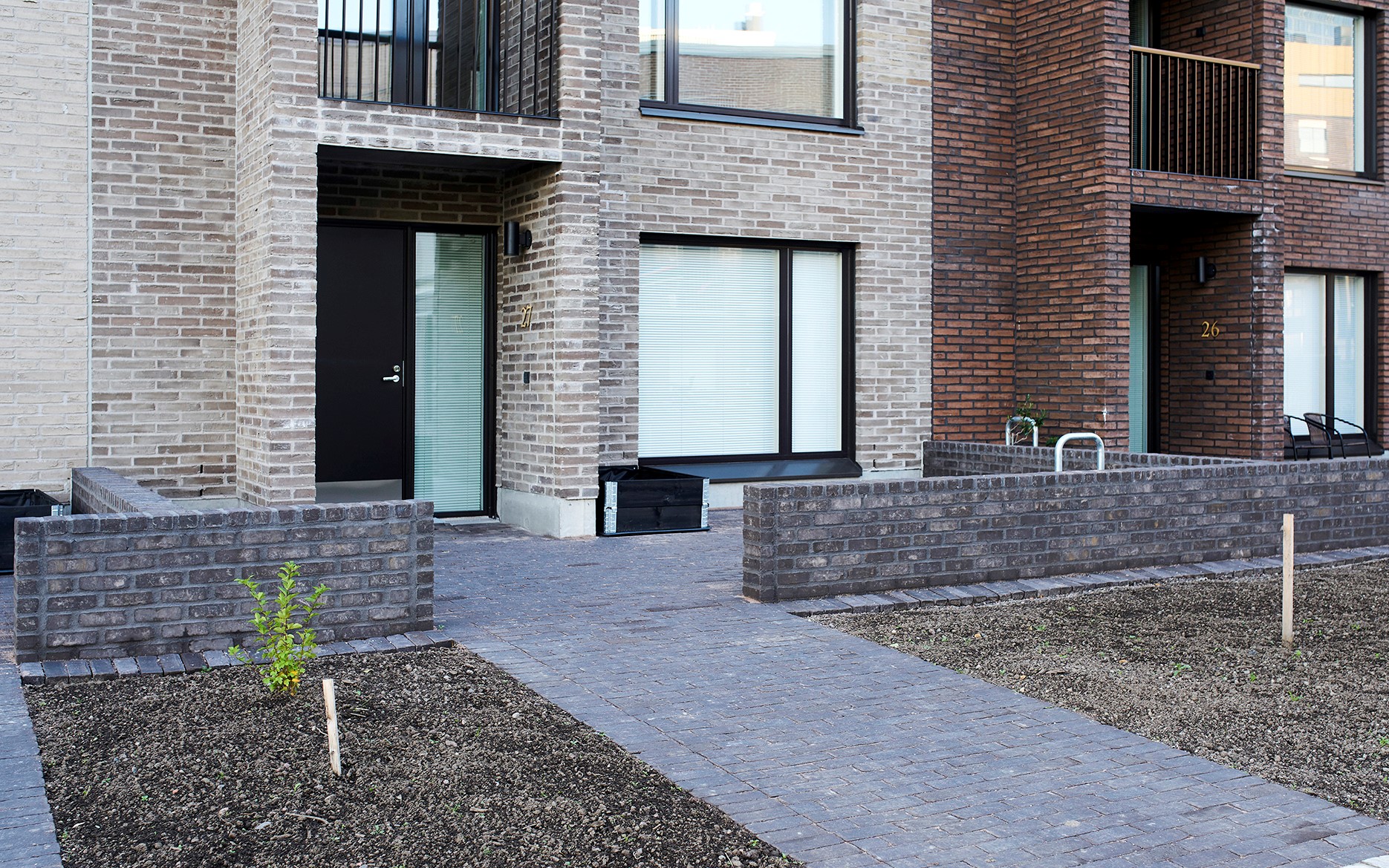 Tiili materiaalina onkin kohteessa todella merkittävässä roolissa. Rakennusten paikalla muurattujen julkisivujen lisäksi pihoilla on matalia tiilimuureja ja maatiilipintoja.