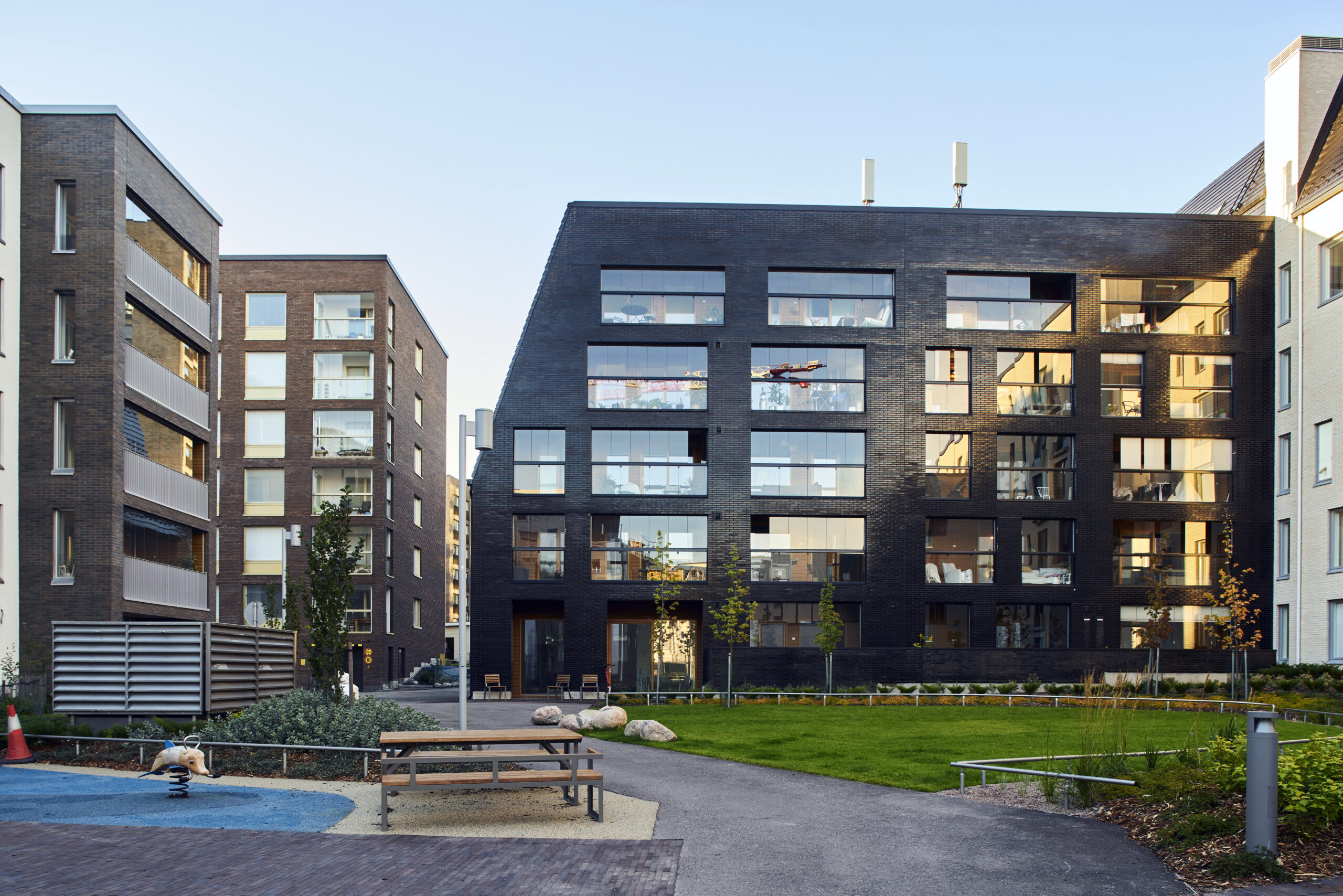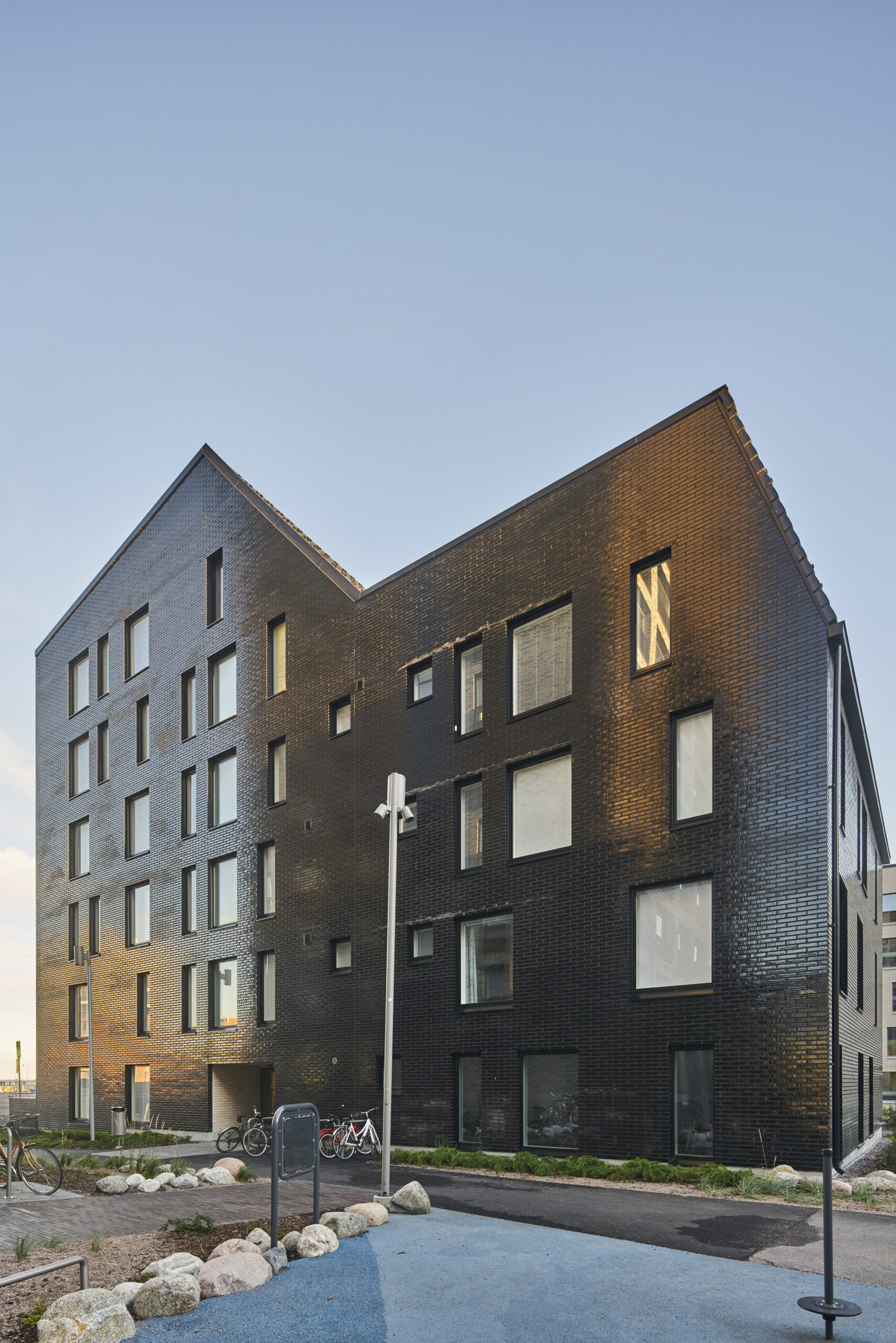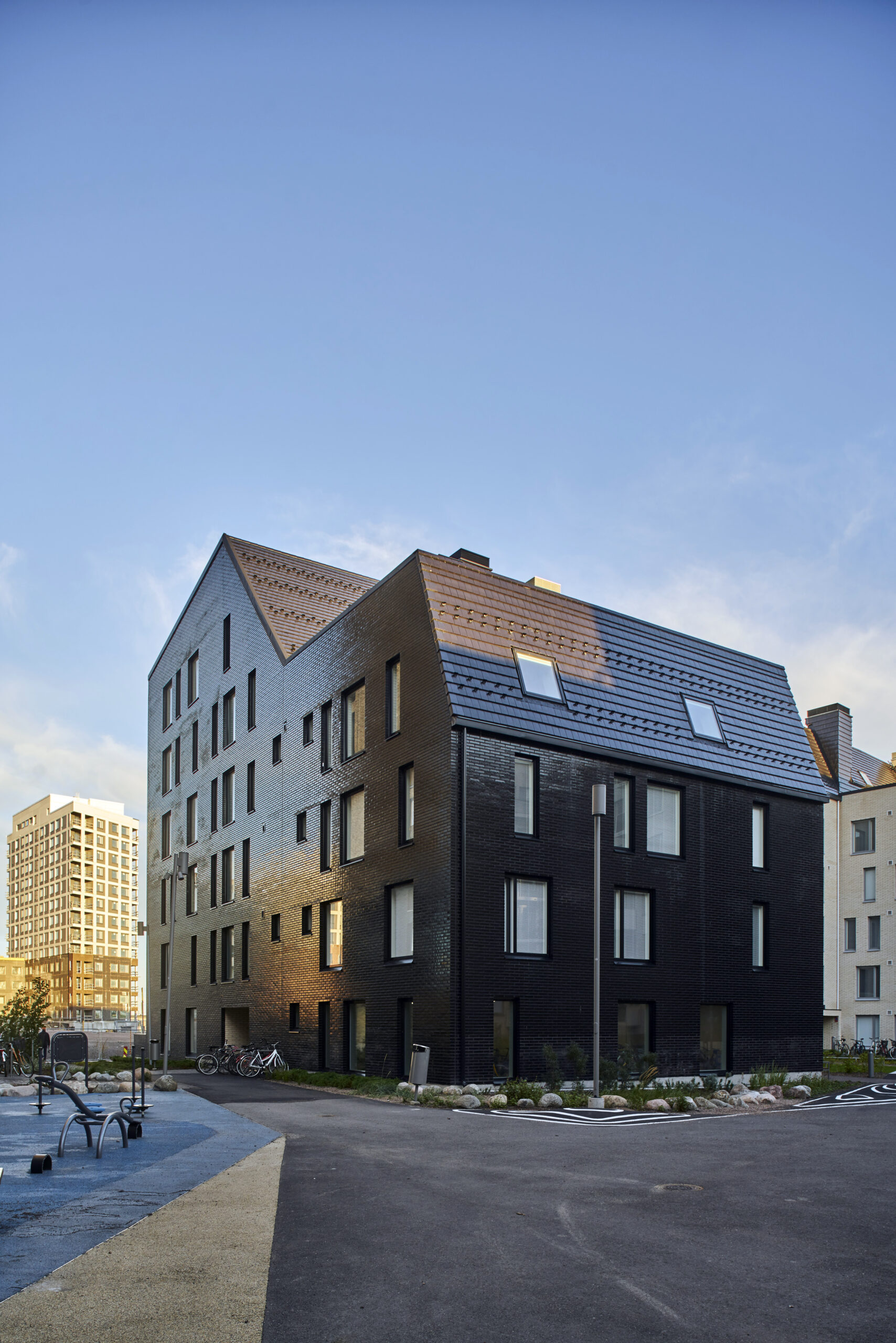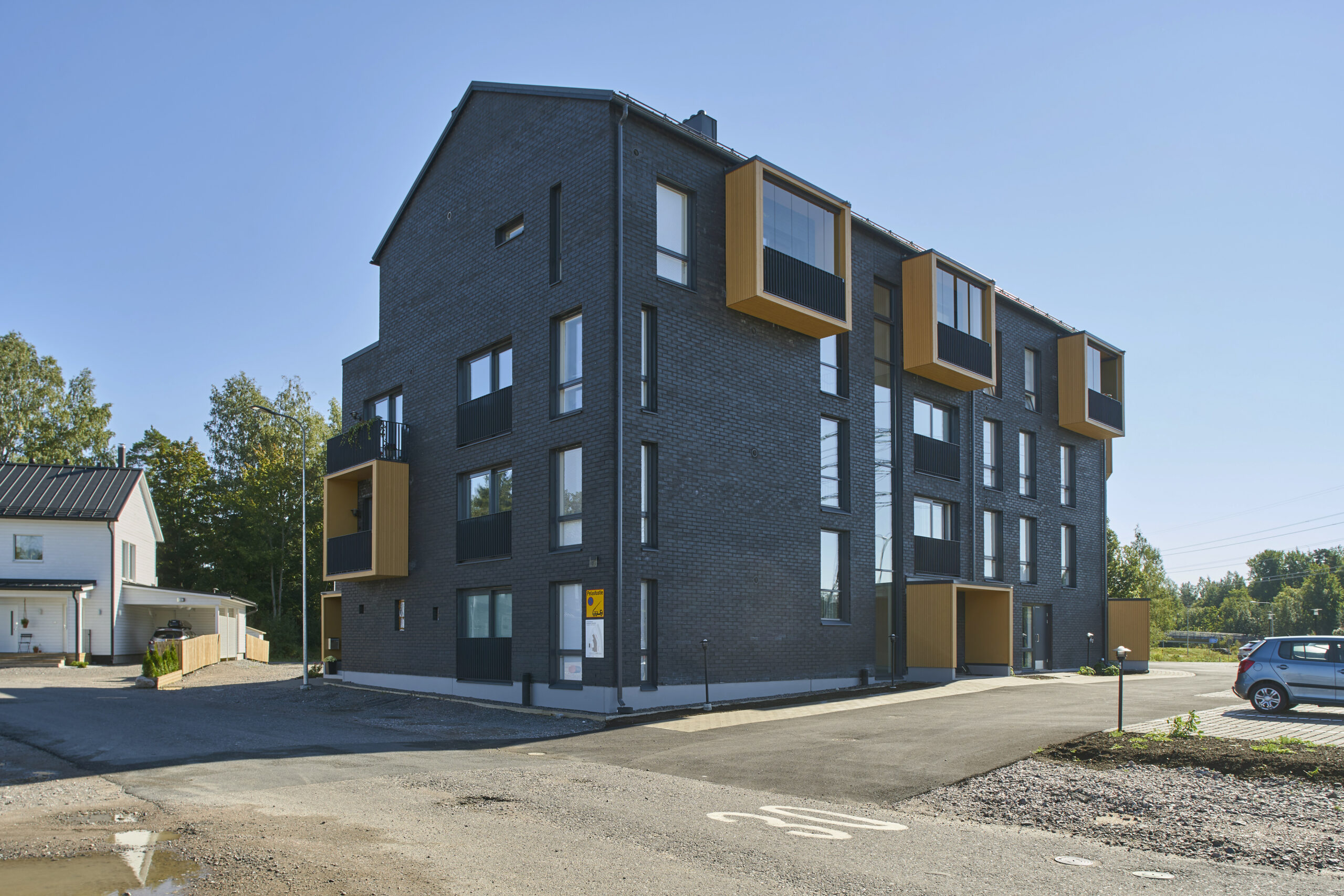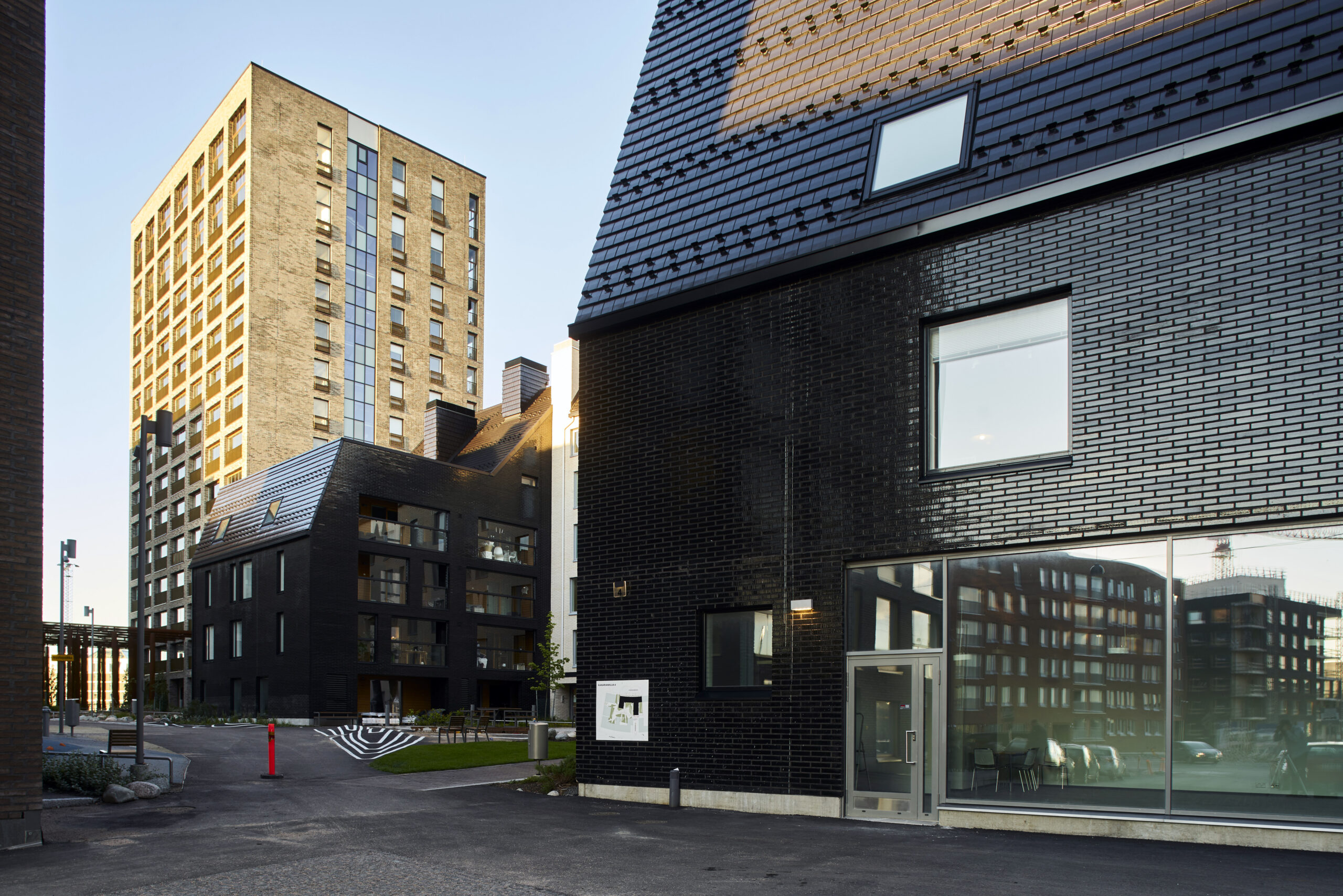 – Tumma julkisivu vaatii rakennukselta selkeitä muotoja ja rauhallisuutta. Valon ja varjon kontrasti ei ole niin suuri kuin vaaleissa rakennuksissa, jolloin pienet muodon muutokset menettävät merkitystä tummassa rakennuksessa. Harkitut tehostevärit luovat mielenkiintoisuutta julkisivujen yksityiskohtiin. Tiilen värinen sauma puolestaan korostaa rakennuksen veistoksellisuutta.