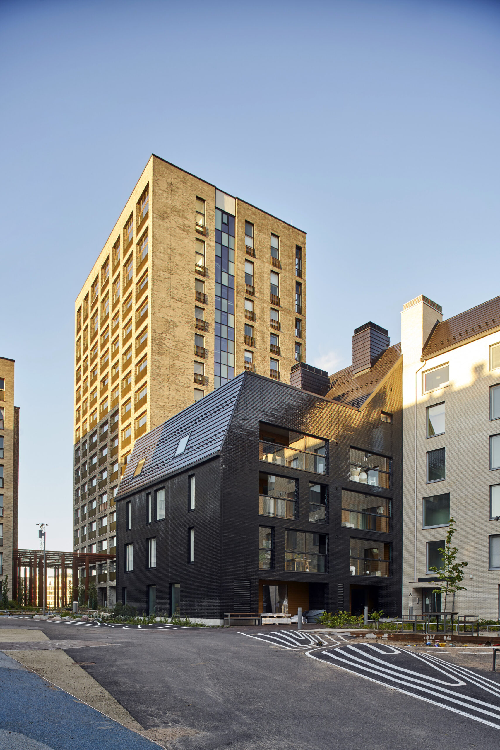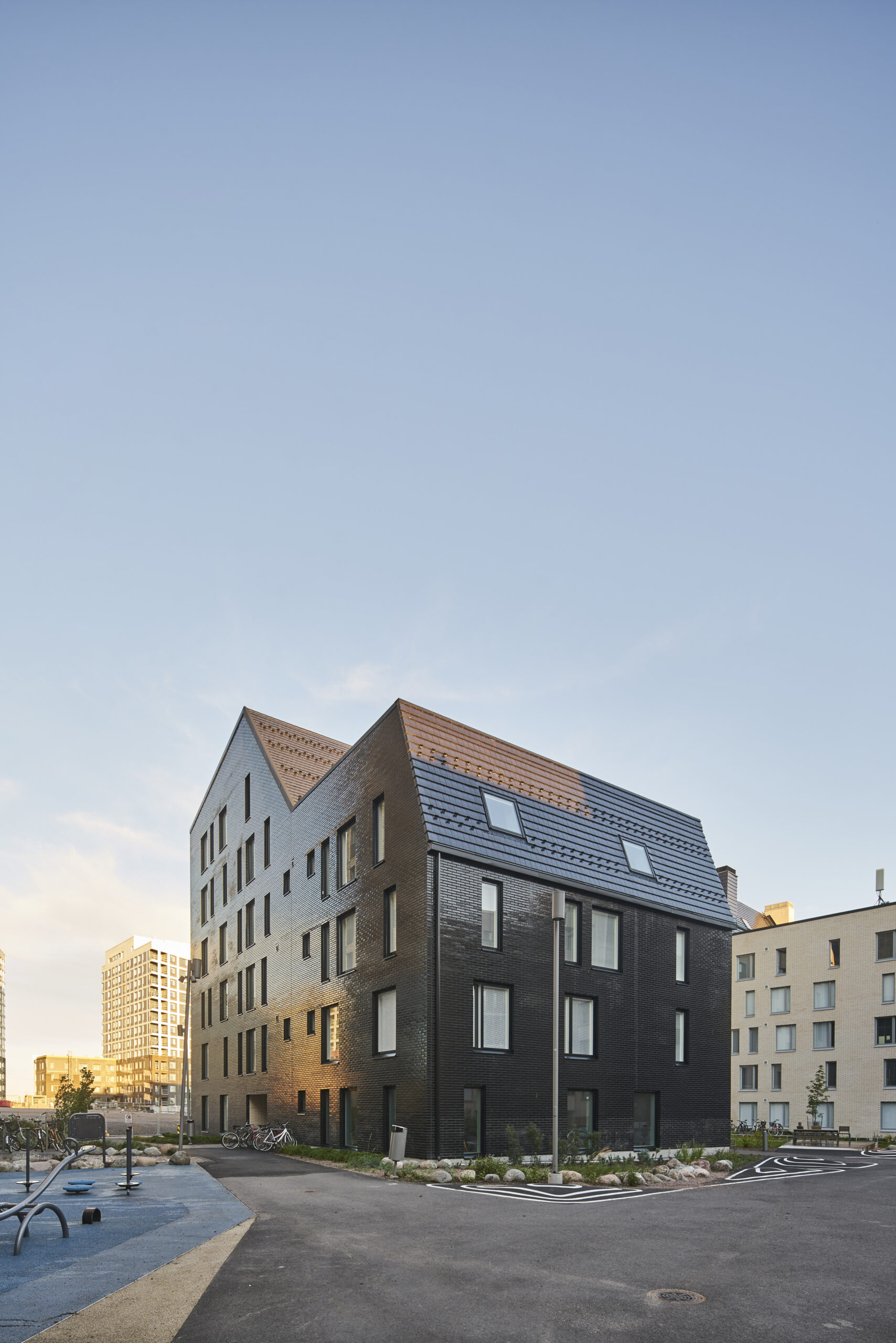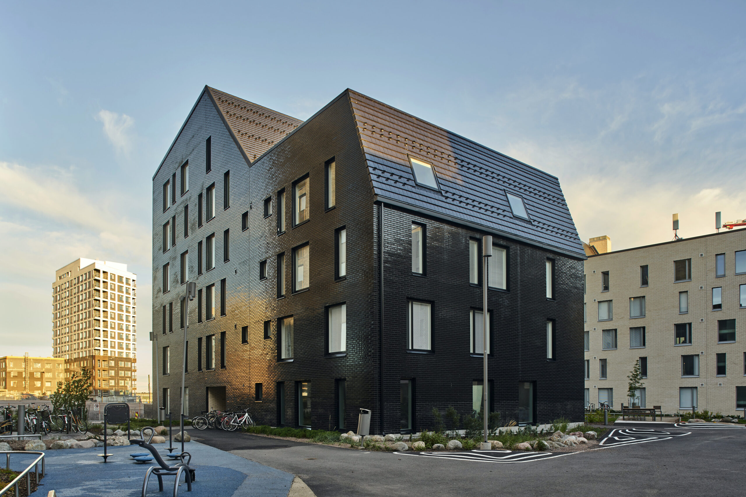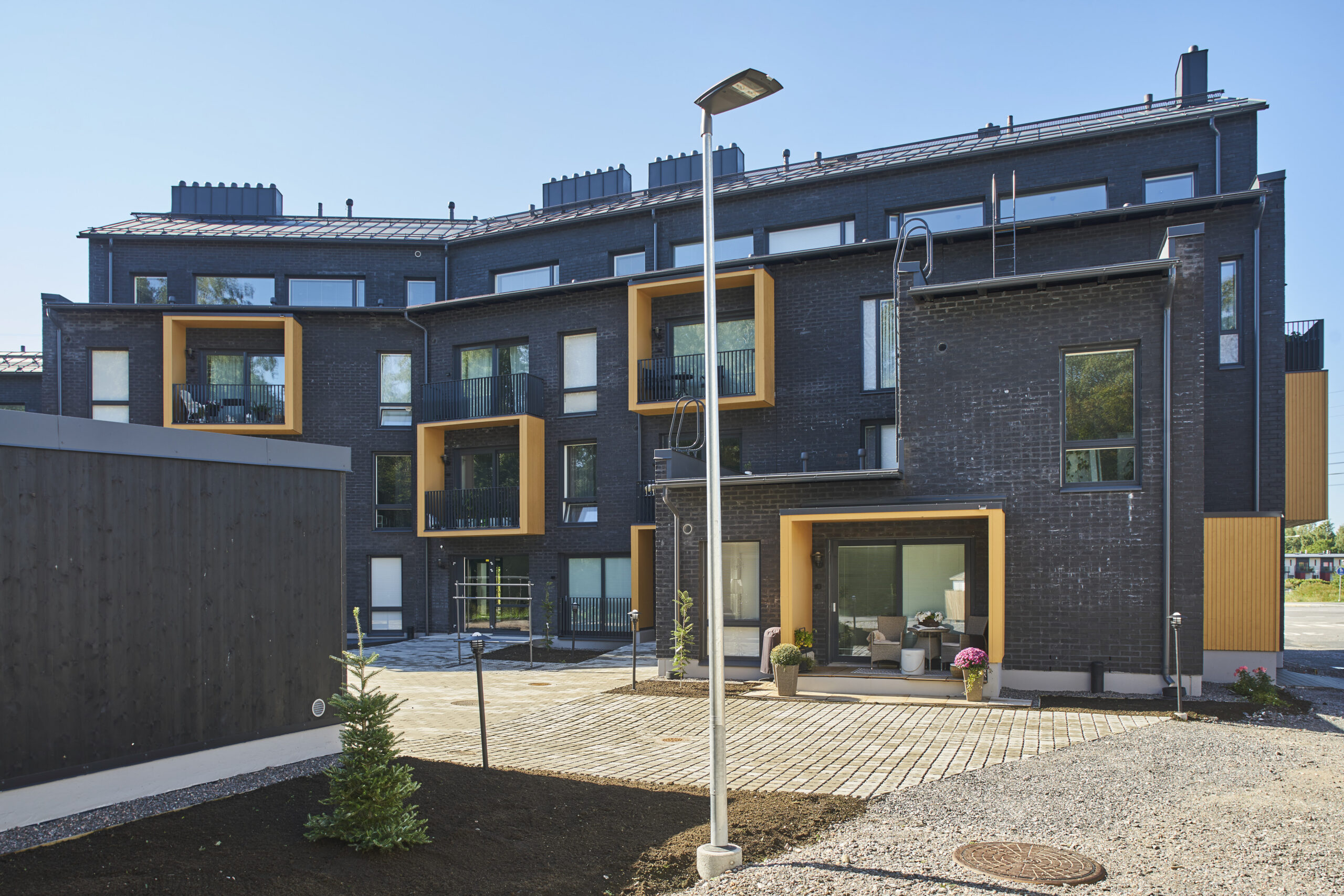 Itä-Helsingissä monimuotoinen As Oy Helsingin Naulakallion Maamerkki on pienkerrostalon ja townhousen yhdistelmä. Tummaa tiilijulkisivua rytmittävät keltaiset tehosteet.