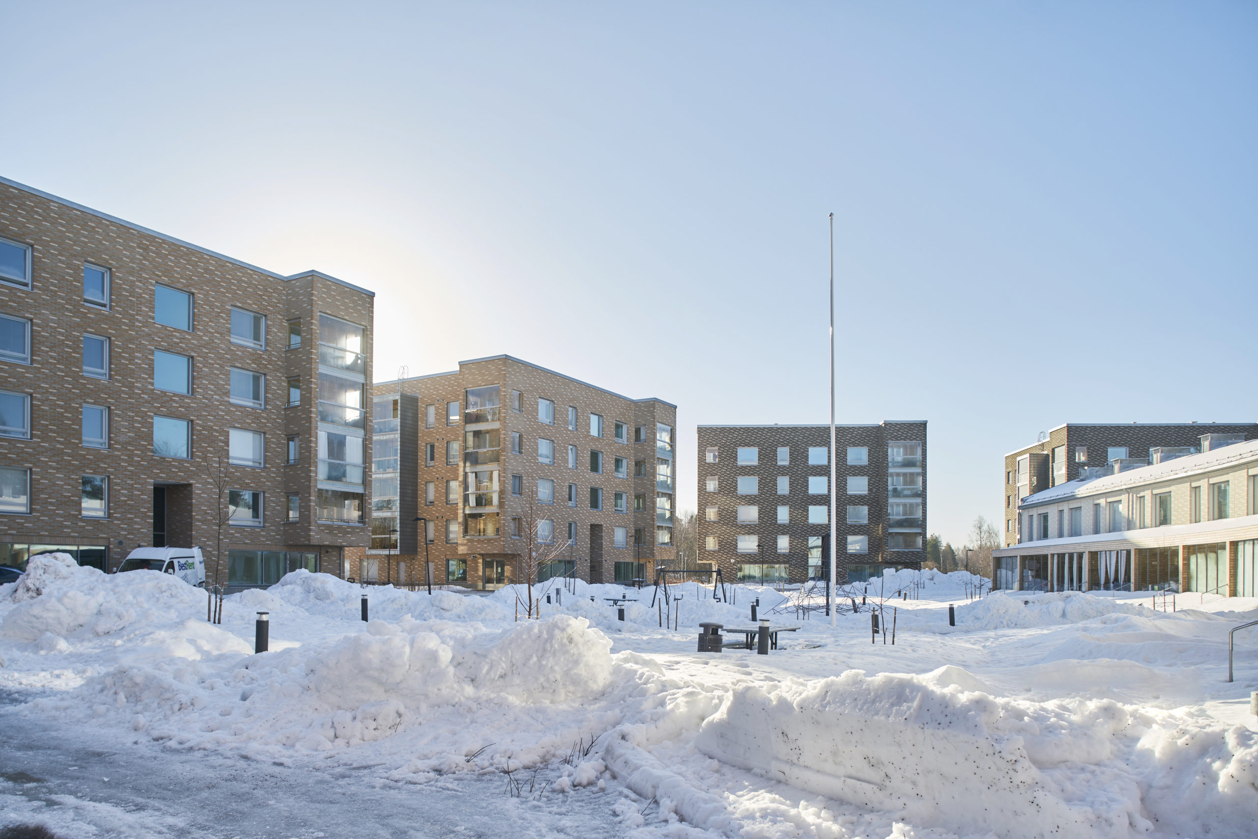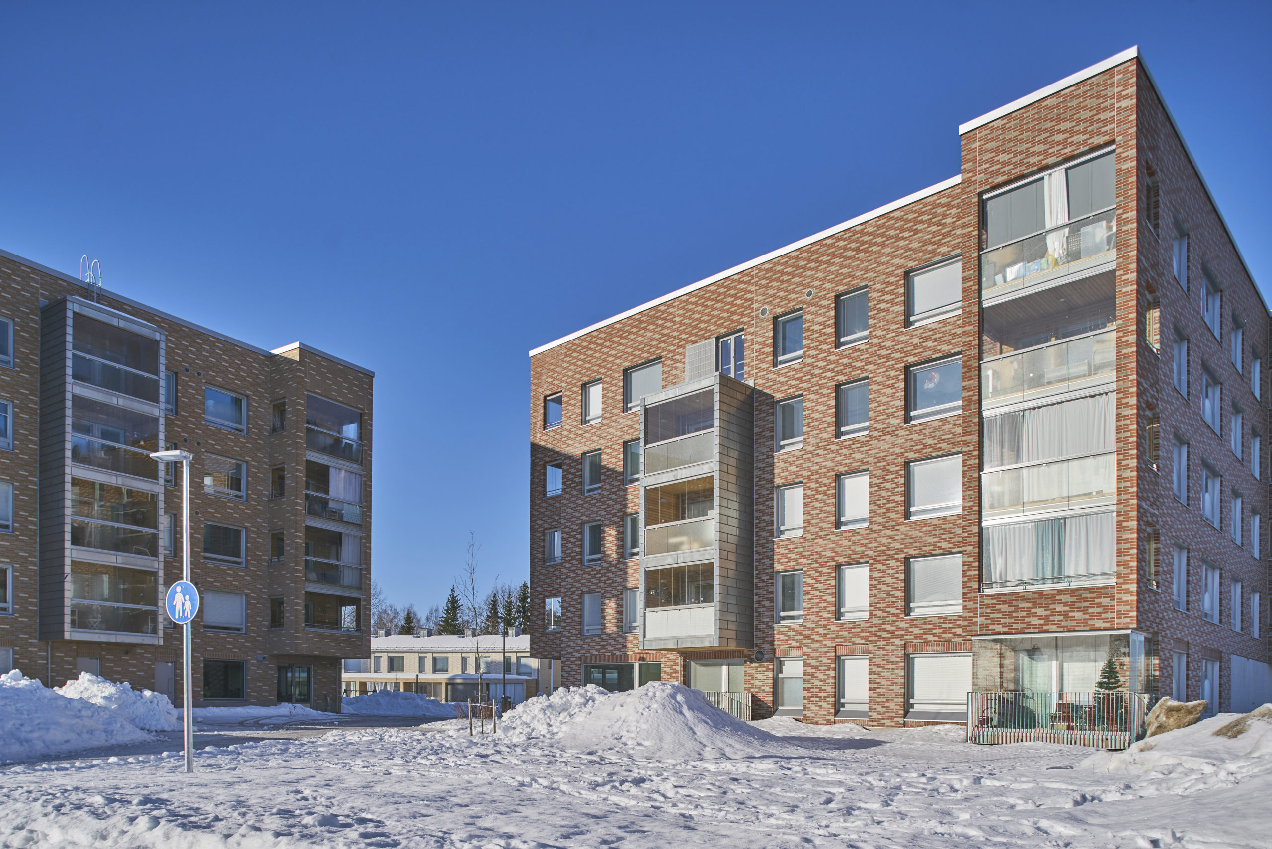 – Rakennustapaohjeissa rakennukset olivat hyvin värikkäitä, perusväreillä rapattuja. Tiili tuntui kuitenkin heti sopivan luonnonläheiseen rakennuspaikkaan sekä pistetalojen kubistiseen massoitteluun. Rivitalon osalta pohdittiin ensin puujulkisivua. Talo haluttiin kuitenkin tehdä betonirunkoisena, jolloin tuntui sopivalta valita siihenkin tiili, arkkitehti SAFA Veikko Mäkipaja kertoo.