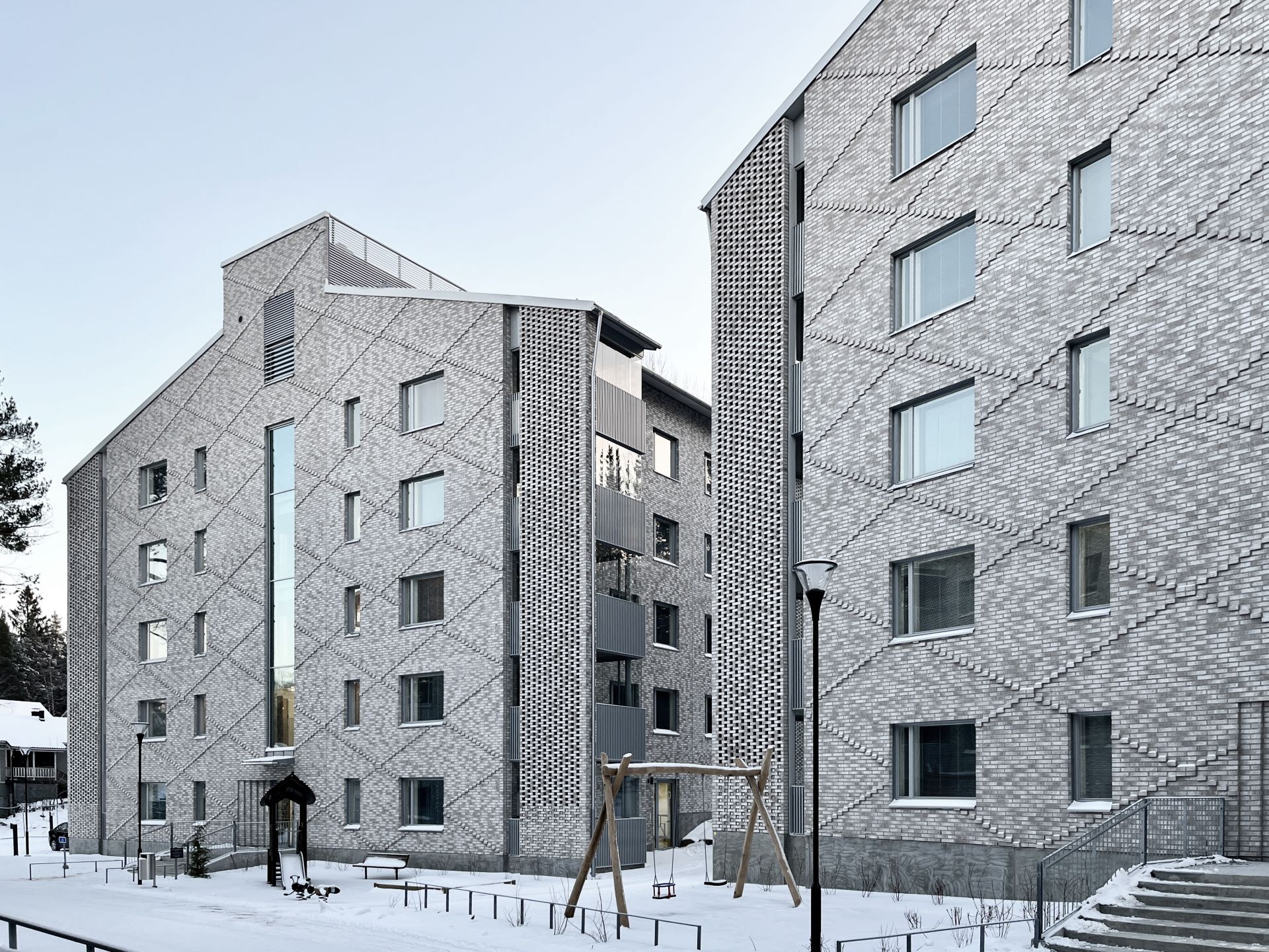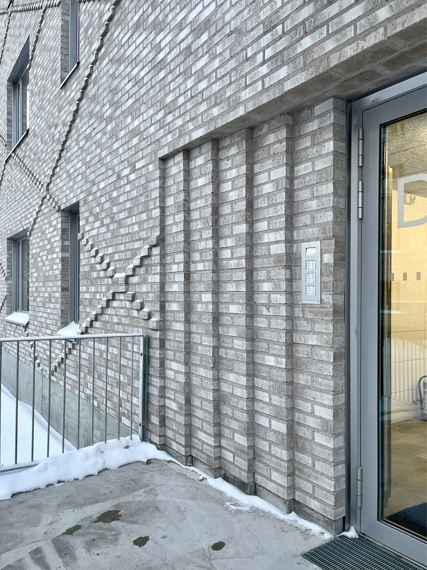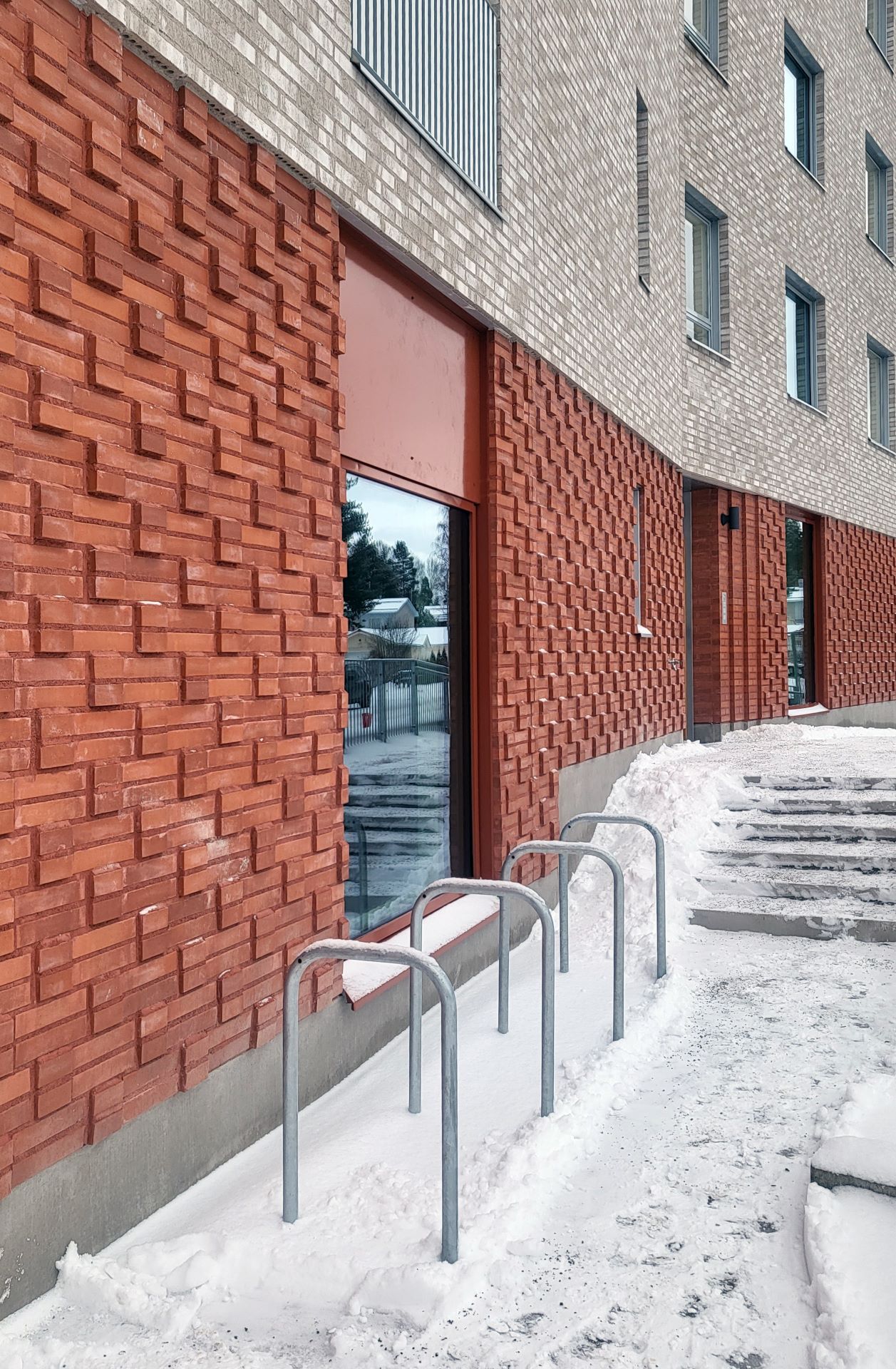 Tontin asemakaavamuutos edellytti julkisivumateriaaliksi vaaleaa rappausta, puhtaaksimuurattua punatiiltä tai puuta. Arkkitehdeille tiilen käyttö julkisivuissa oli ensisijainen valinta. Kun Wienerbergerin tiilivalikoimasta löytyi sopiva vaalea tiili, materiaalipaletti alkoi olla selvillä.