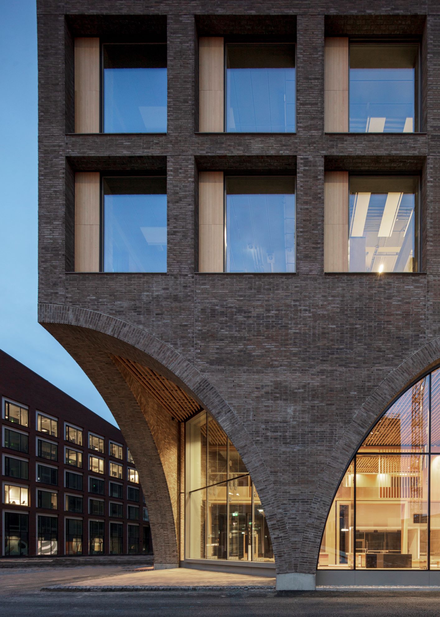 Tiilikaaret ja arkadit viittaavat rakentamisen historiaan. Materiaalin tuntu ja talotekniikan näkyminen osaltaan ilmentävät rakennuksen käyttötarkoitusta ja käyttäjiä − rakennetun ympäristön ammattilaisia.