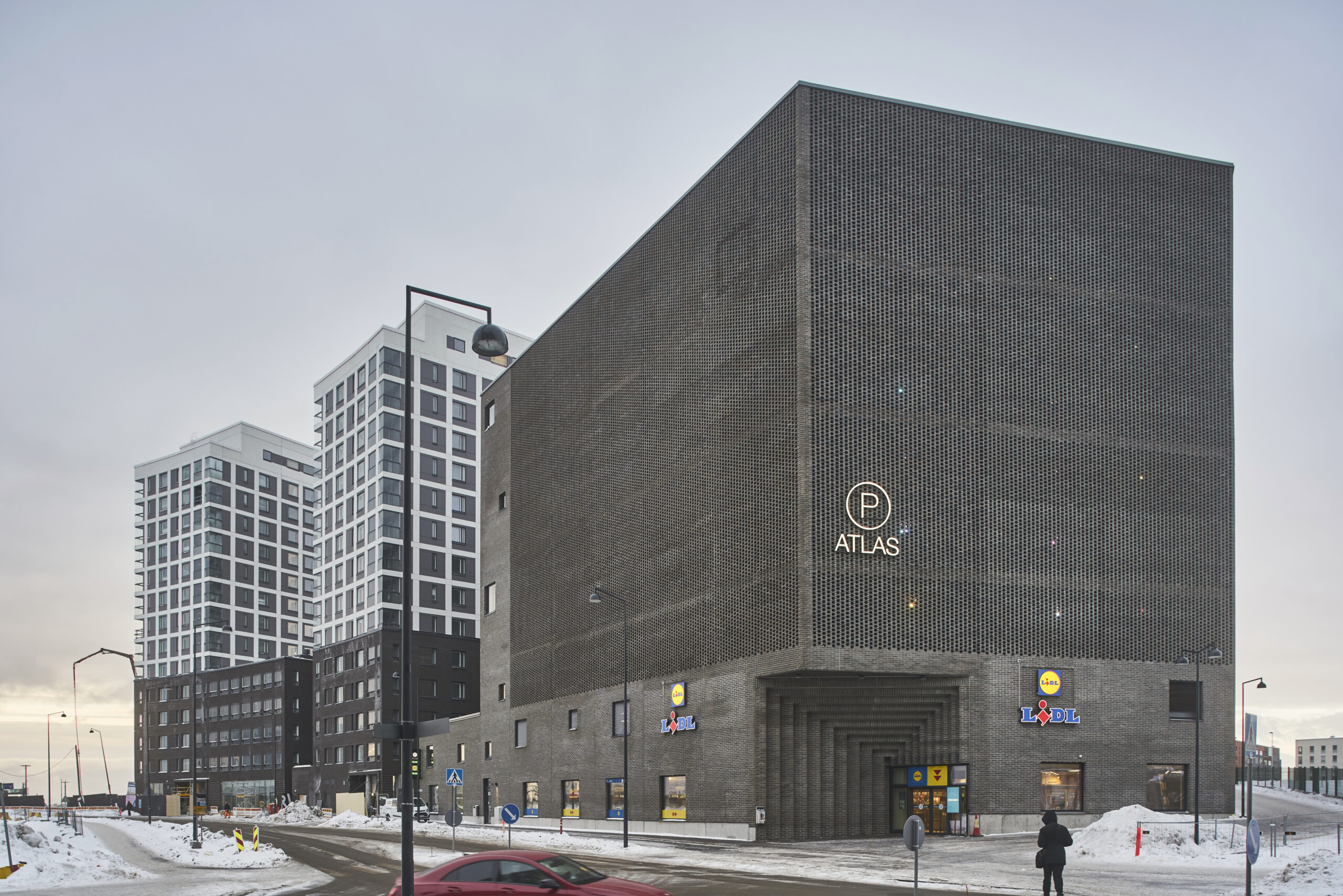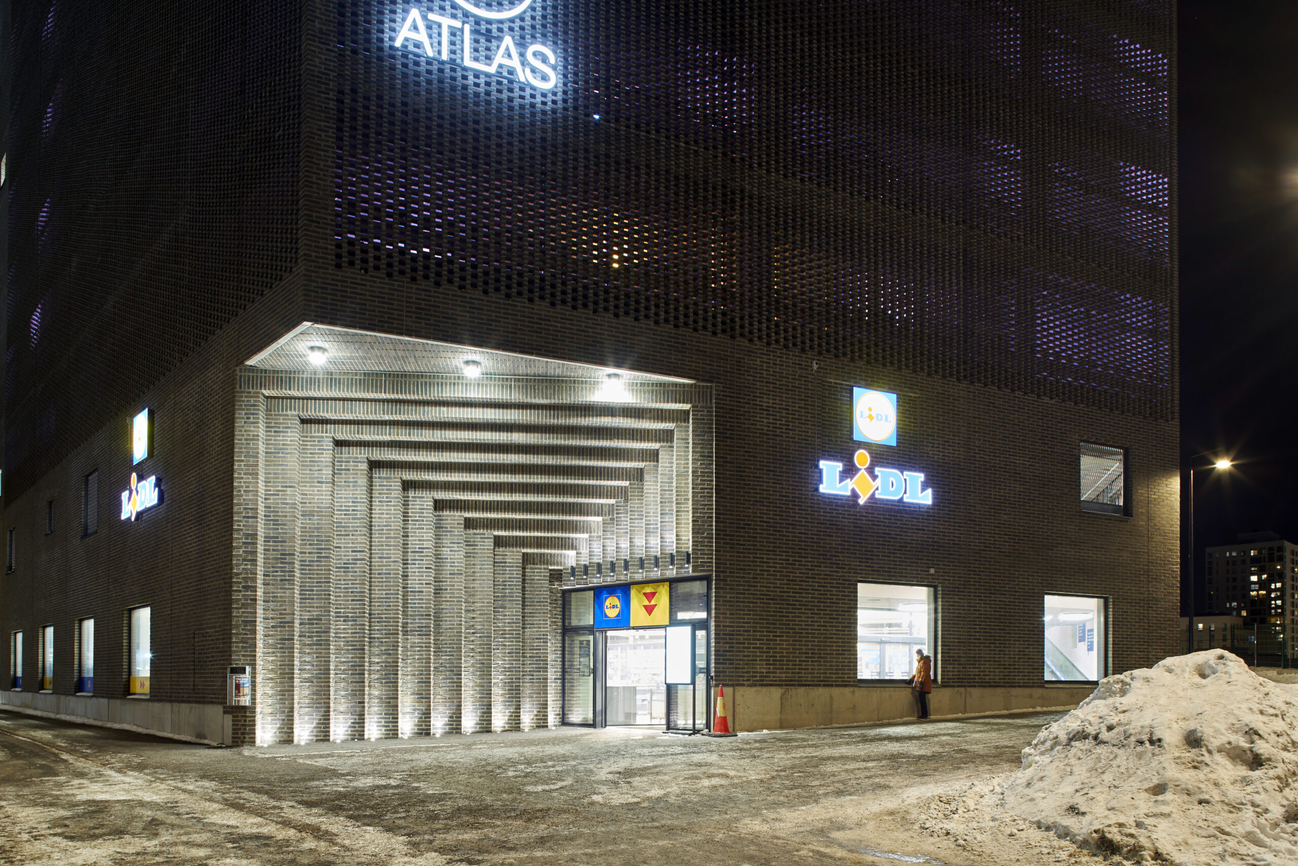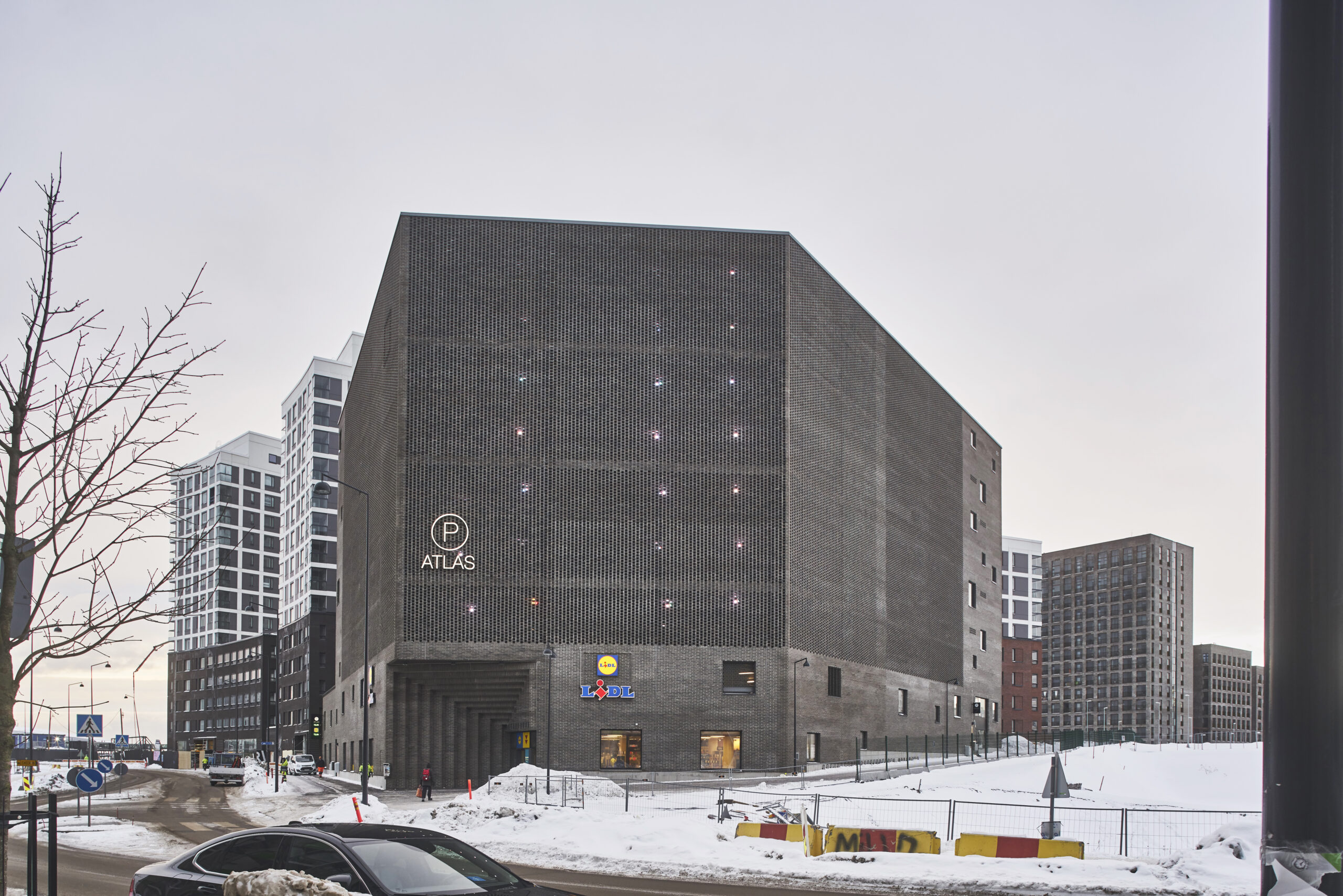 Muurattua pintaa P-Atlaksessa on noin 4 000 m2, niin umpeen muurattuna kuin perforoituna. Päivänvalossa pitsimuurausta tuskin erottaakaan, mutta pimeällä pysäköintikerrokset muuttuvat läpi heijastuvien valojen ansiosta satujen taikalyhdyksi. Silloin P-Atlaksen julkisivun tiilimuurauksessa leikkivät valo ja varjot.
