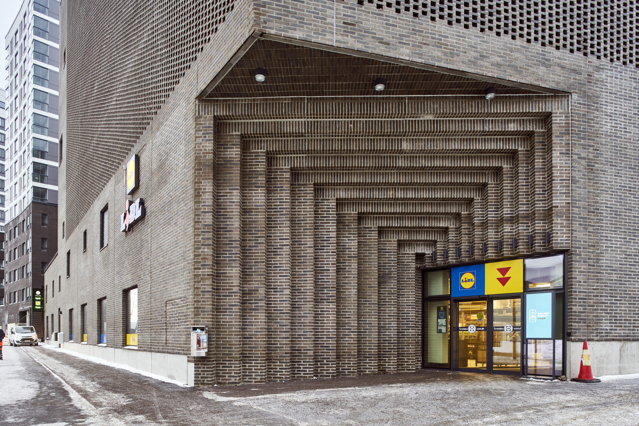 Rakennuksen päivittäistavaraliike sai julkisivuun selkeästi tunnistettavan pääsisäänkäynnin tiilireliefin avulla. Aikanaan kaupunkikeskutojen vanhoihin tiilikerrostaloihin suunniteltiin komea pääsisäänkäynti ja myymälän reliefisisäänkäynti on Inaron arkkitehtien moderni tulkinta aiheesta.