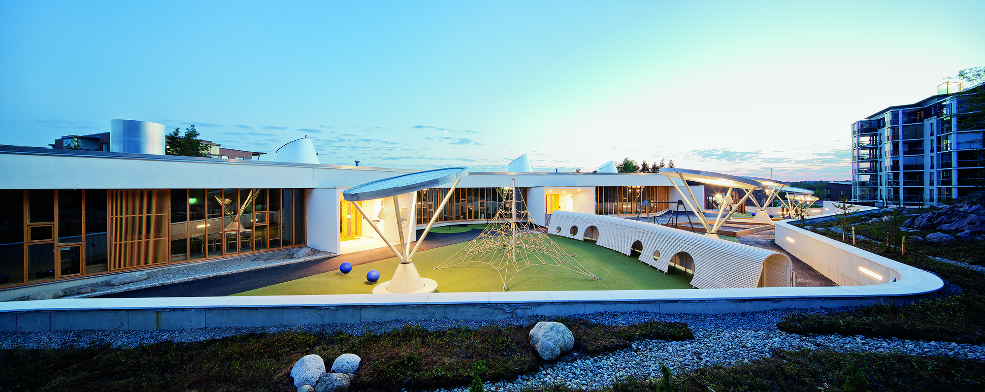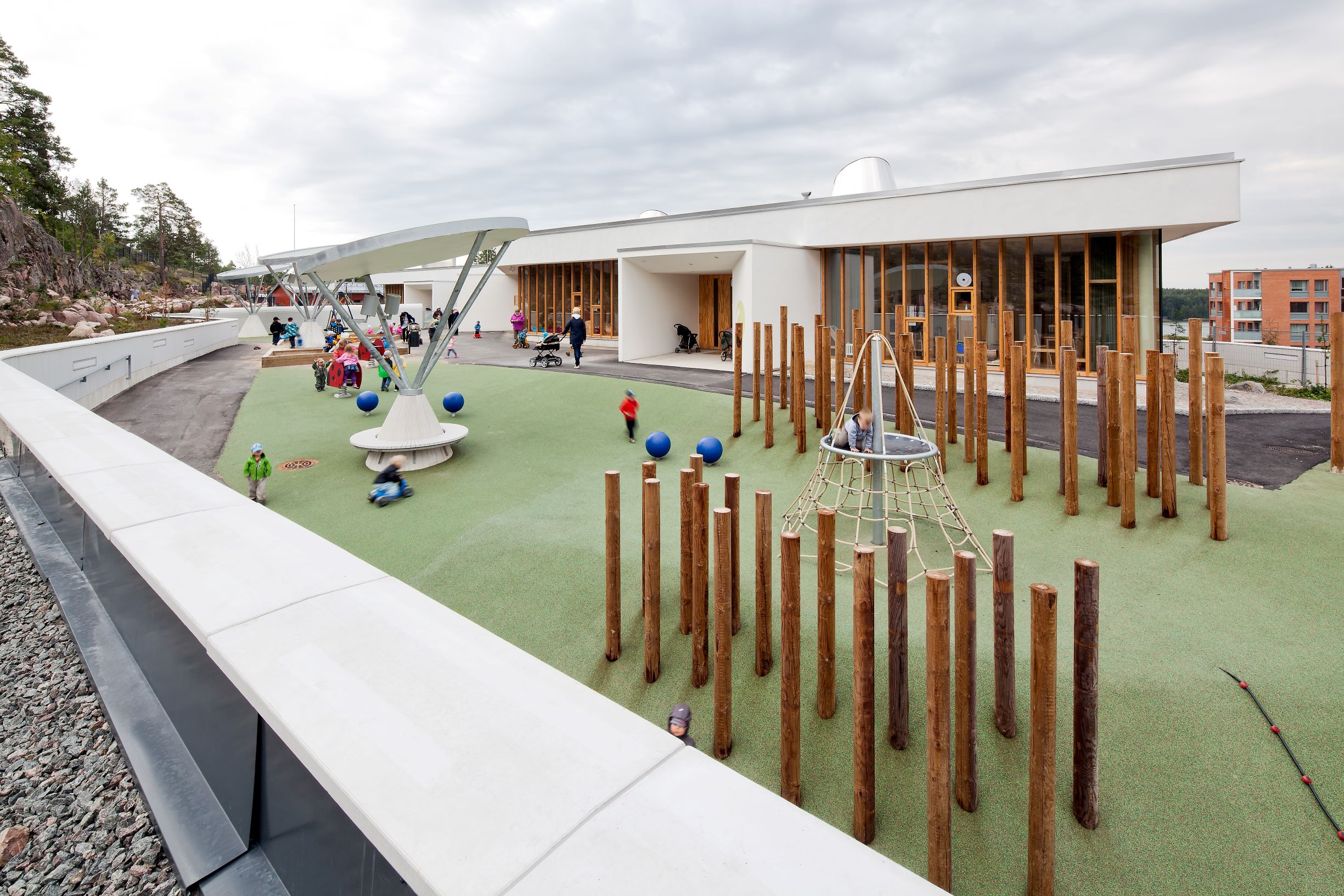 Vuonna 2011 valmistunut Saunalahden lastentalo oli uuden asuinalueen ensimmäinen julkinen rakennus. Rakennuspaikka oli vaativa: pitkä, kapea tontti kadun ja kalliojyrkänteen välissä. Saunalahden päiväkodista ja neuvolasta järjestetyn suppean kutsukilpailun voitti Arkkitehtitoimisto JKMM Oy:n ehdotus Mato Matala.