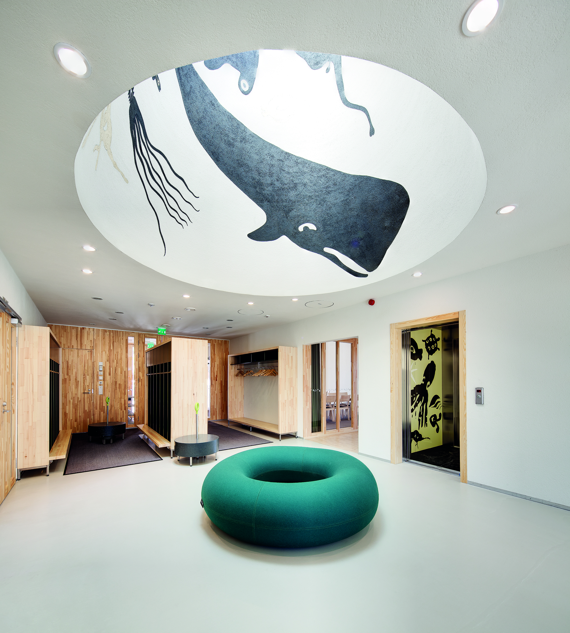 Monin paikoin taide on yhdistetty toiminnallisuuteen. Graafikko Aimo Katajamäen maalaamat eteistilojen kattosuppiloiden kuviot, muun muassa mustekalat, meritähdet ja meteoriitit, ovat taideteoksia ja opasteita, joiden avulla jokaiselle ryhmälle on luotu tunnistettava ilme. Suppilot tuovat luonnonvaloa tiloihin, mutta myös vaimentavat ääniä kuten myös sisustusarkkitehti Päivi Meurosen akustisia pintoja hyödyntävät sisustusratkaisut. Ilona Ristan suunnittelema akustinen paneeli puolestaan integroituu ilmanvaihtokanaviin ja kaapistoihin.