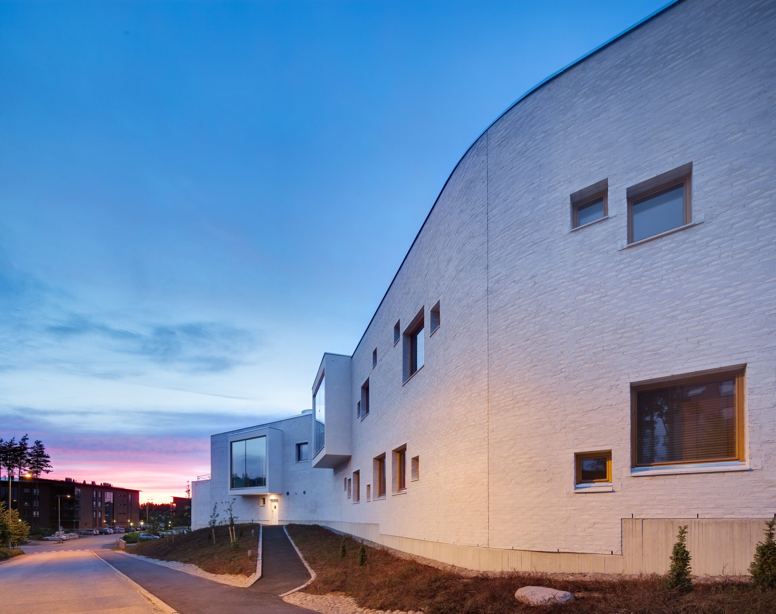 Kadulle päin suuntautuvaa julkisivua rytmittävät erikokoiset ikkunat. Pihalle päin rakennus avautuu lattiasta kattoon ulottuvin ikkunoin, joten pienetkin lapset voivat katsella maisemaa.