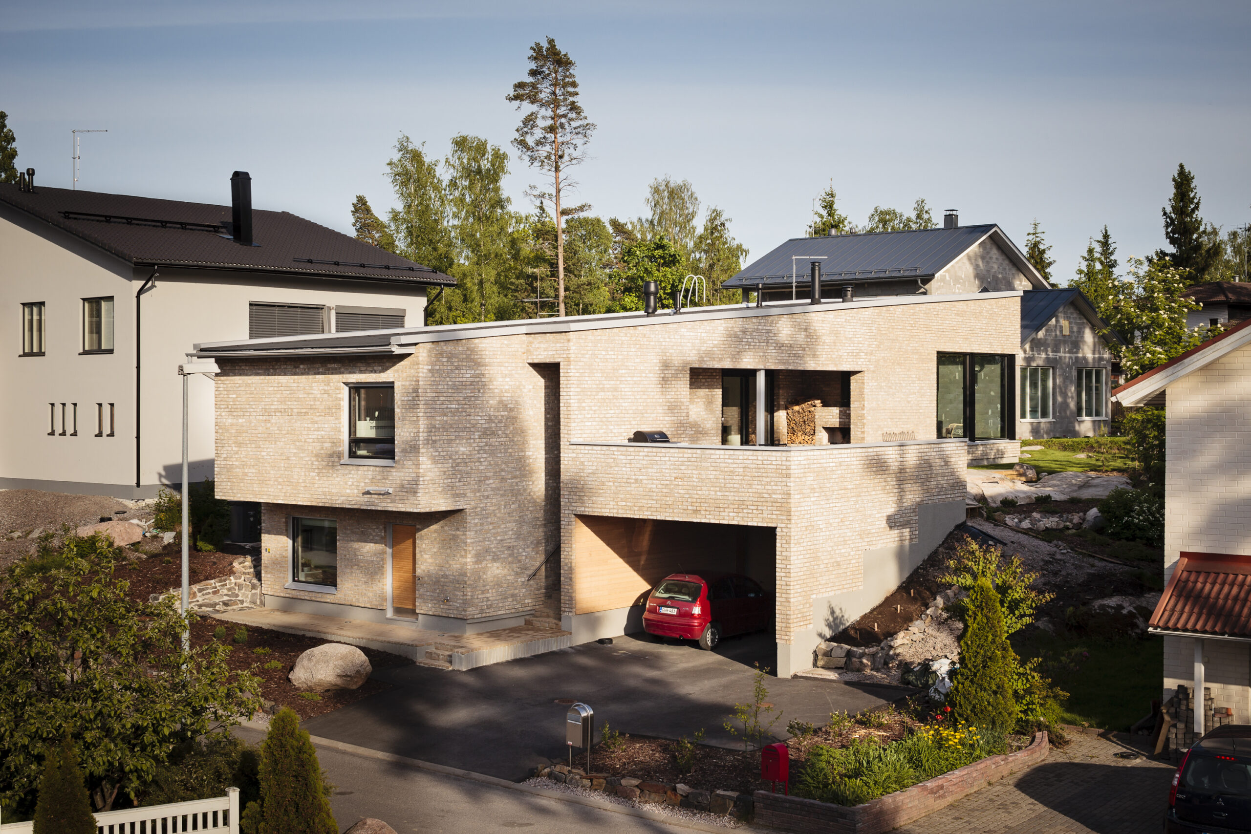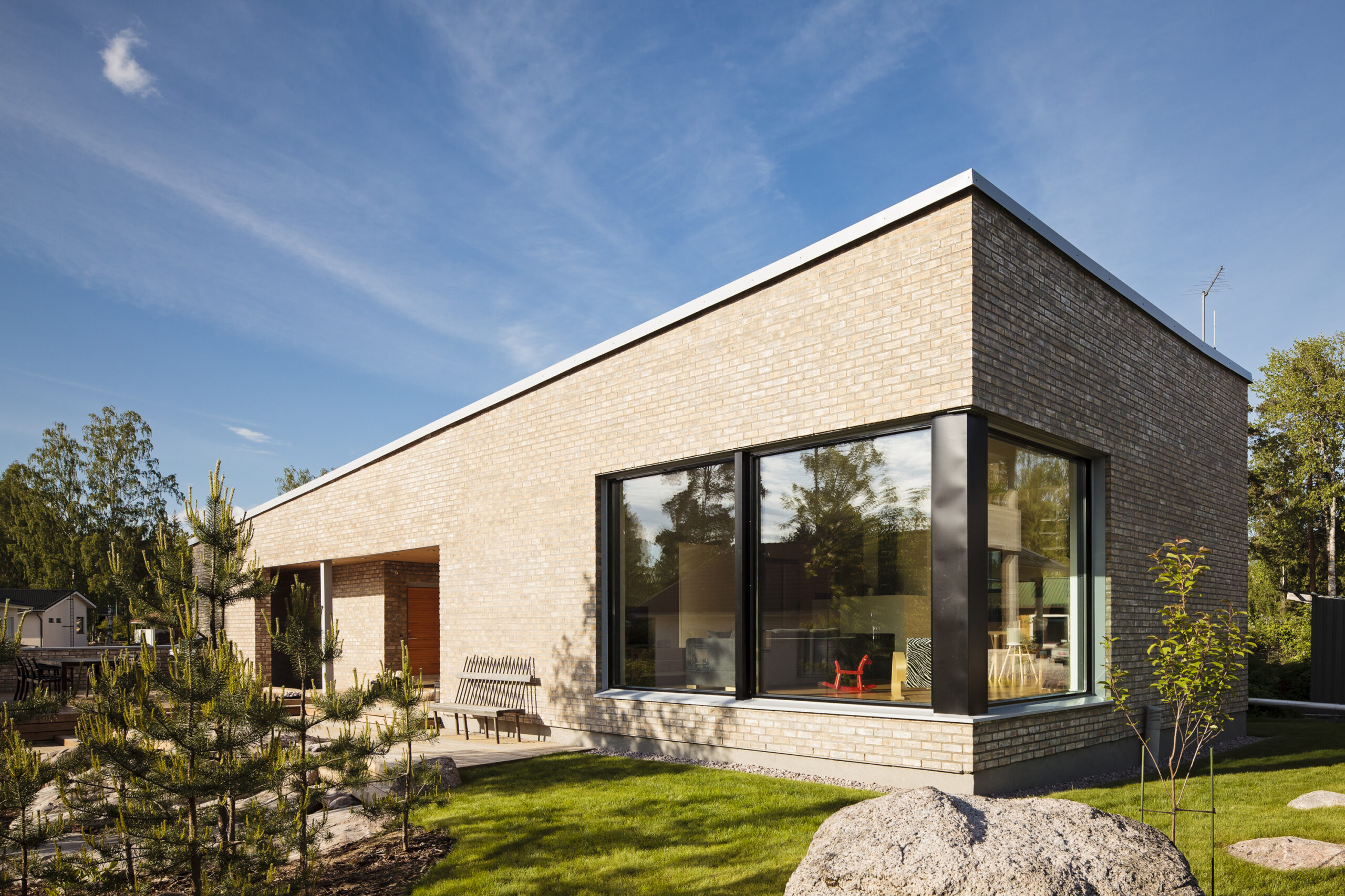 Rinnerakentaminen antoi täystiiliselle omakotitalolle mahdollisuuden olla luonteeltaan sekä avoin että suljettu. Oleskelualueet täydensivät kokonaisuuden, jolla koko tontti otettiin haltuun.