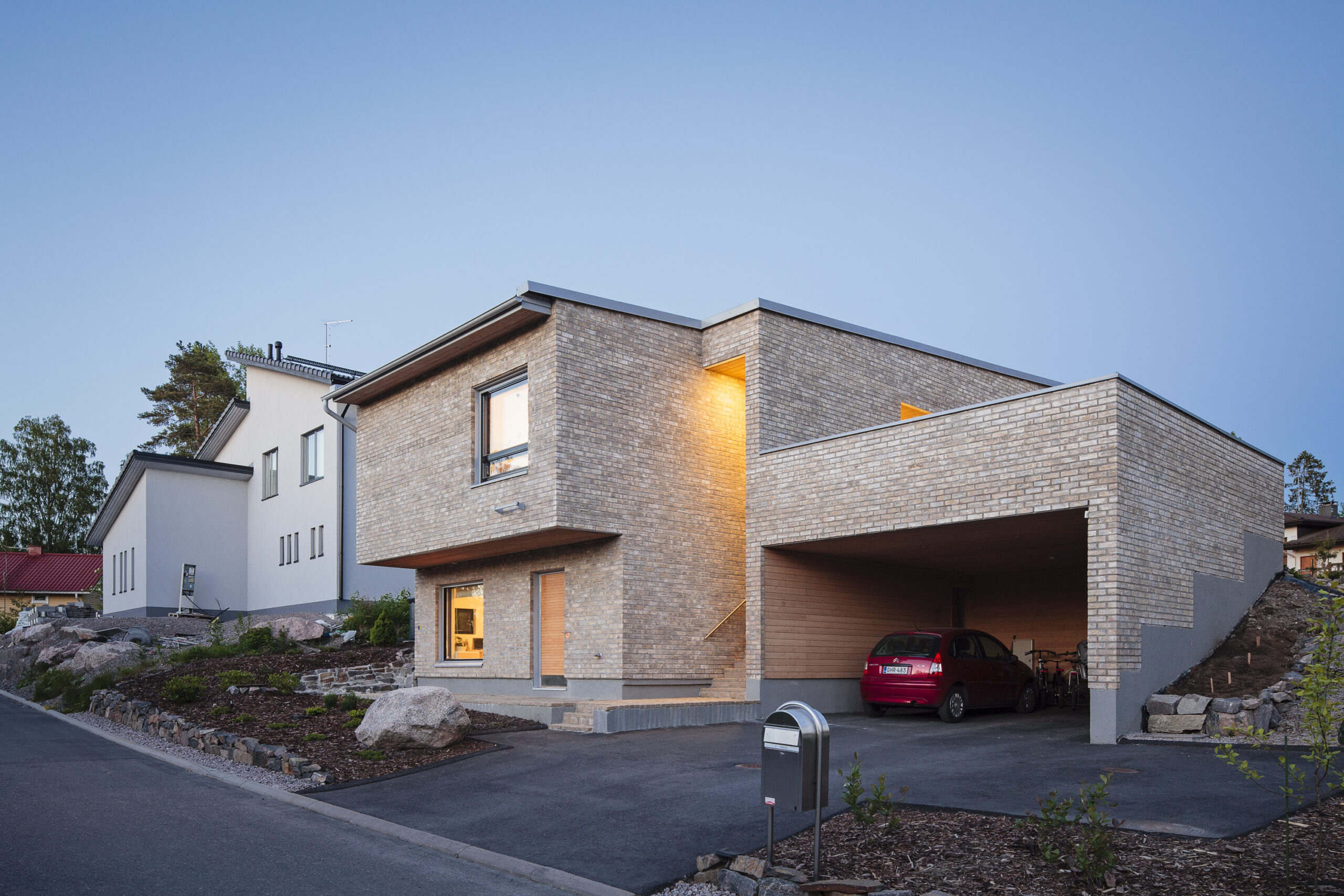 Katettu, takalla varustettu oleskelutila sisäänkäynnin yhteydessä on toteutettu rakennusmassaan lovettuna. Autokatoksen päällä on puolestaan kattamaton terassi. Se on reunustettu tiilimuurilla, joten siellä voi nauttia auringosta katseilta suojassa.