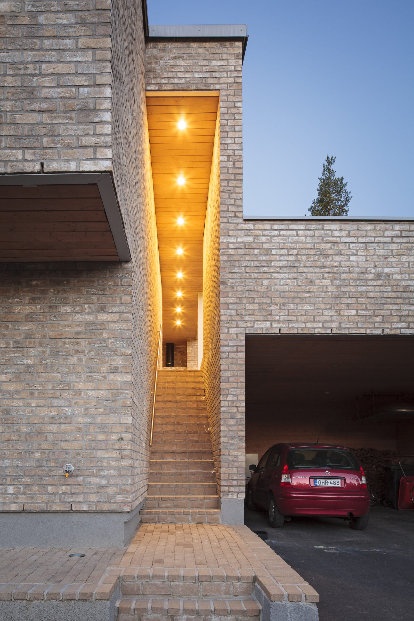 Yhtenäinen materiaali antaa rakennukselle eheän ilmeen. Vaaleanruskeaa tiiltä on käytetty kauttaaltaan, myös ulkoportaissa.