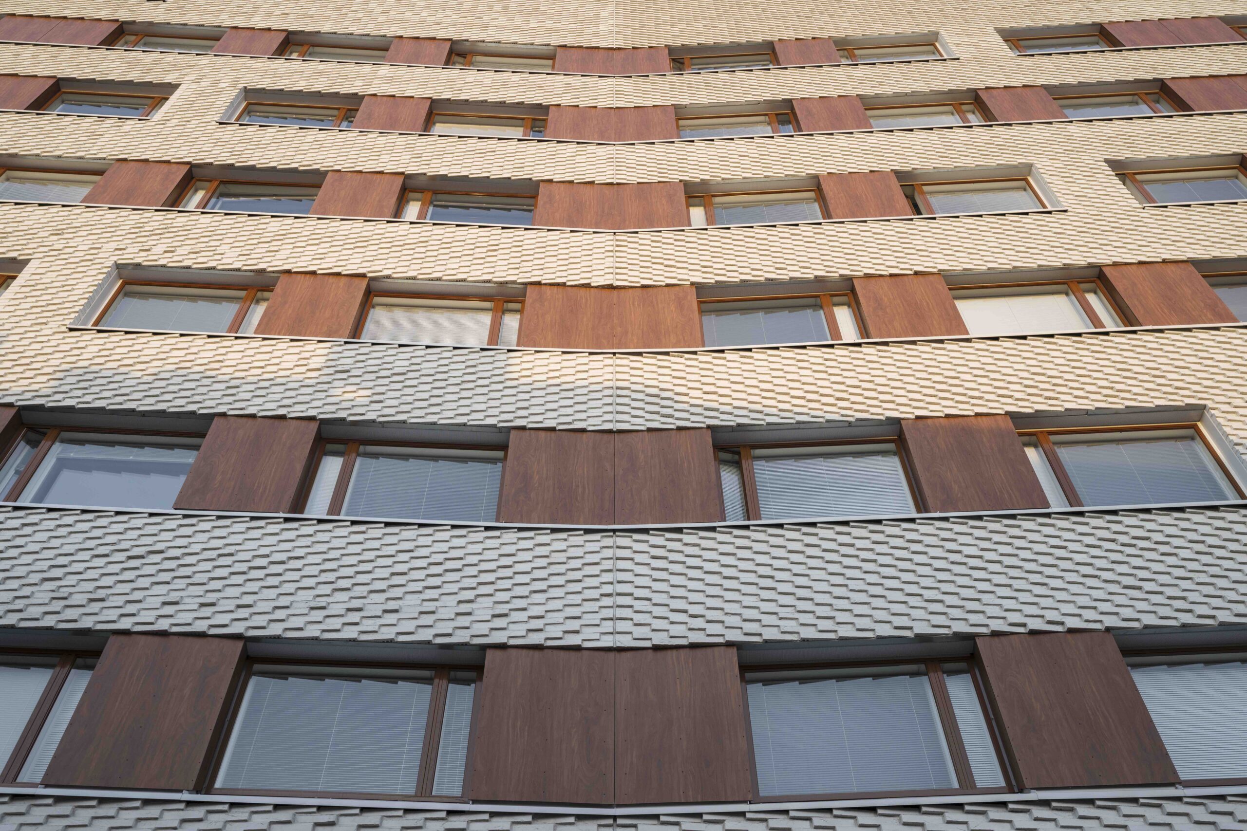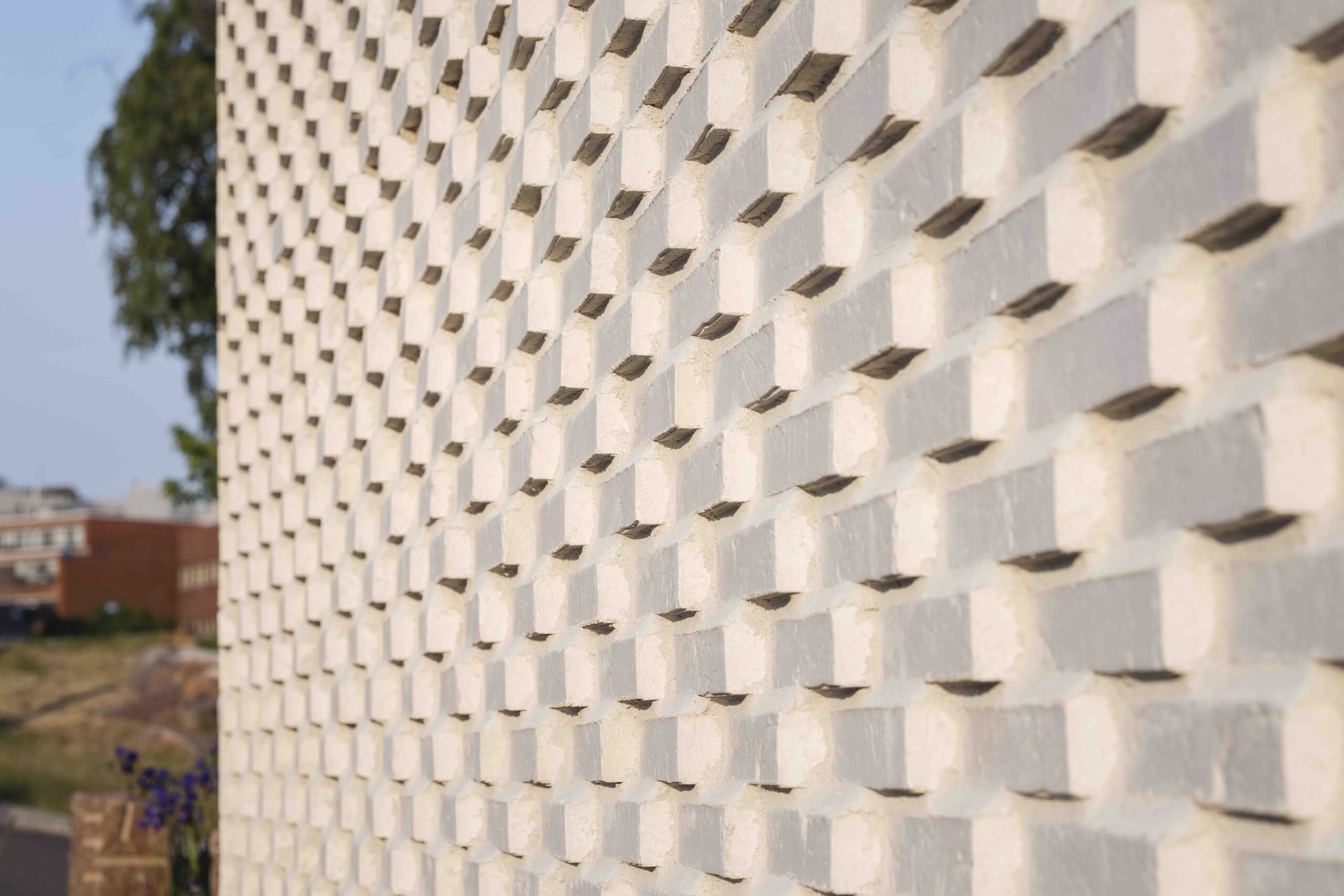 Tiilet on muurattu reliefimäisesti ja osin hammastaen eli tiilen nurkka on jätetty näkyviin. Lopputulos on erittäin tyylikäs.
