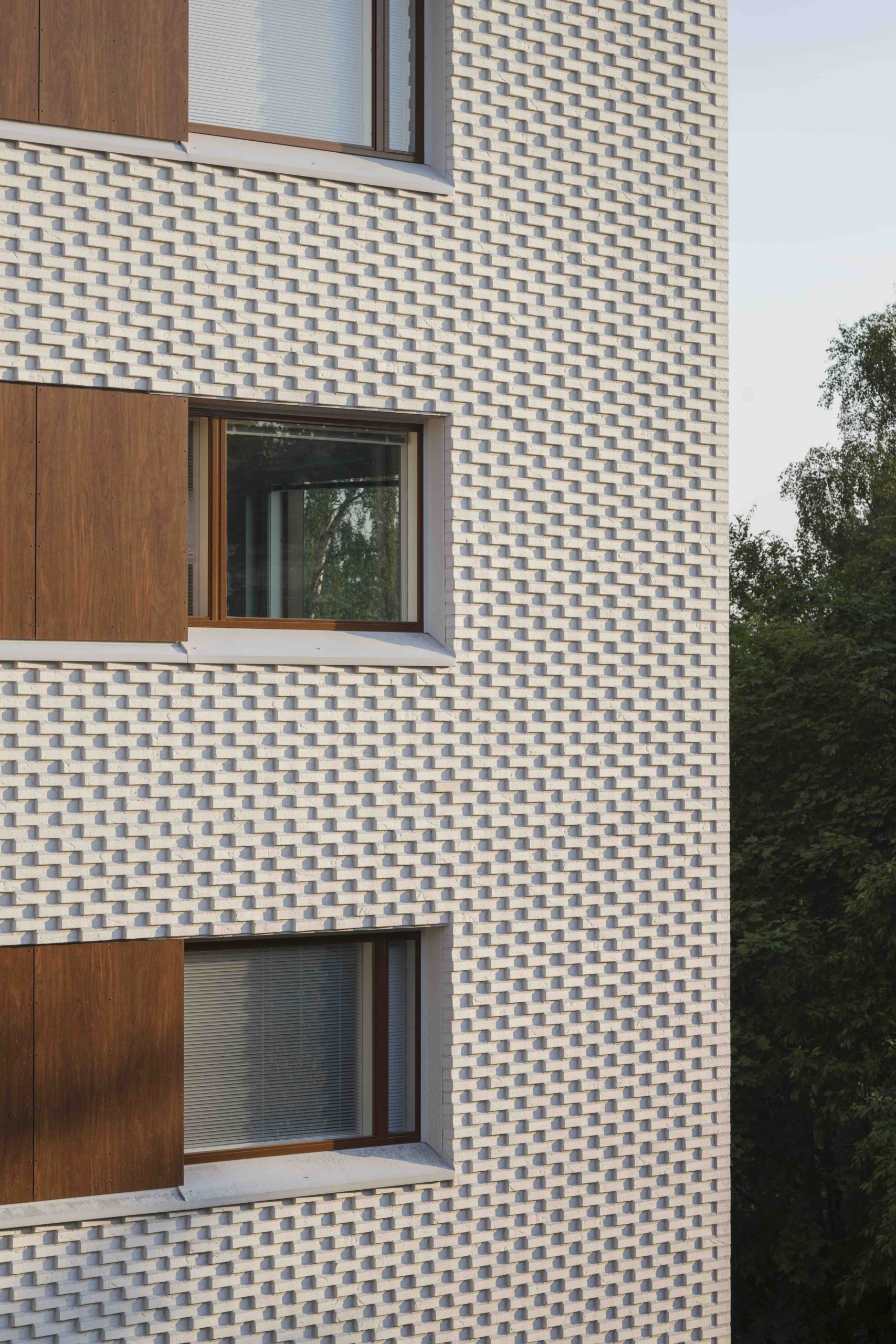 – Taloudelliset seikat ja tehokkuus edellyttävät suurta runkosyvyyttä. Se tekee pistetalosta ilmeeltään raskaan ja suhteiltaan pönäkän. Taite on eräs keino jäsentää volyymia hoikempiin vertikaaleihin vyöhykkeisiin, Siitonen toteaa.