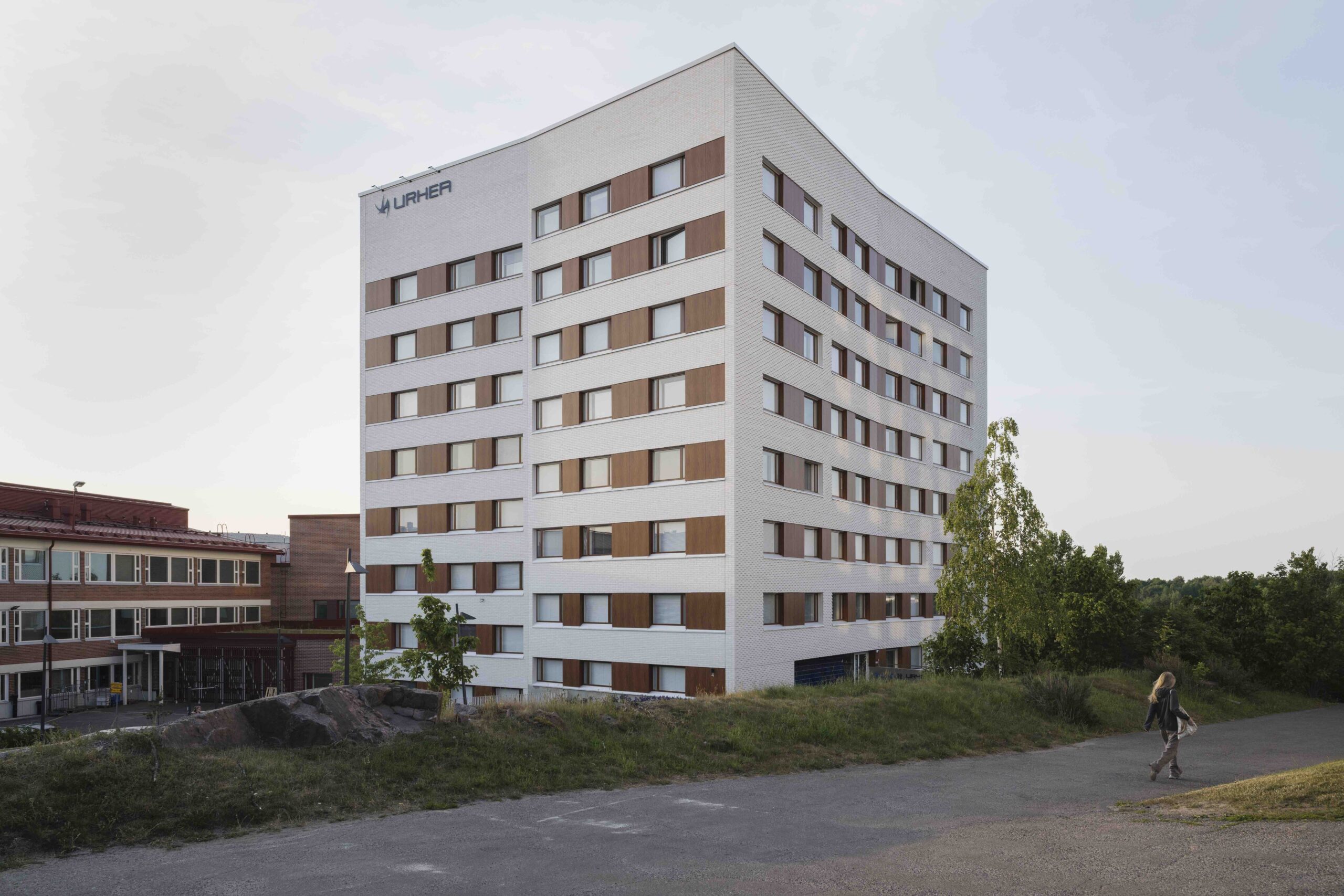 Urhea-kodille antaa persoonallisen ilmeen taivutettu fasadi, joka erottaa sen lähellä olevista 1960-luvun tornipistetaloista. Auringon liikkumisen myötä taloon tulee eri lailla valaistuja pintoja.