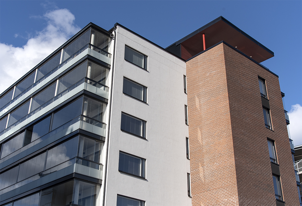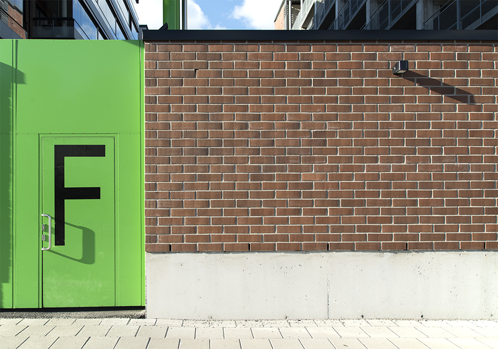 Sekä muuri että osa rakennusten seinistä on Raikkosen tiilitehtaan punaruskeaa sileää tiiltä. Punatiili heijastelee läheisen vanhan tehdaskiinteistön materiaaleja. Tiilipintaa on kolmessa rakennuksessa yhteensä 2260 m².